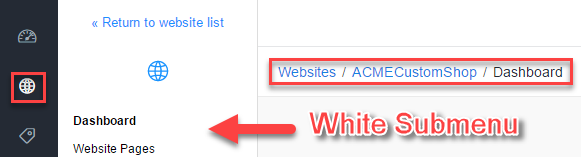 Sub Menu is white - affiliate website configuration. You can still access the main menu on the far left to get back to the Fulfillment Center level configuration.