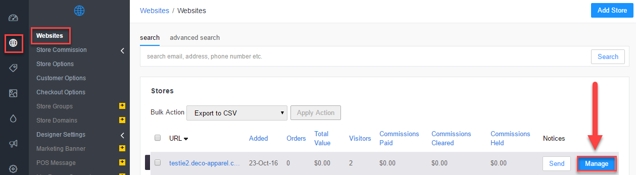 As a Fulfillment Center on the Premium or Enterprise plan, it is likely that at some point you will need to switch between stores. This can be done in two ways. The first is via the Websites icon, which displays the list of websites the Fulfilment Center runs. Click Manage to configure the corresponding store.
