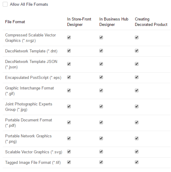 - Ticking Allow All File Formats will permit users to upload any graphics file as part of a design of the process type selected. Disabling this will let you choose which file formats are acceptable, and in which areas of DecoNetwork they will be permitted.