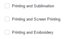 Settings for DTG Printing, Sublimation, Transfer, Rhinestone, DTF Printing, and UV Printing.