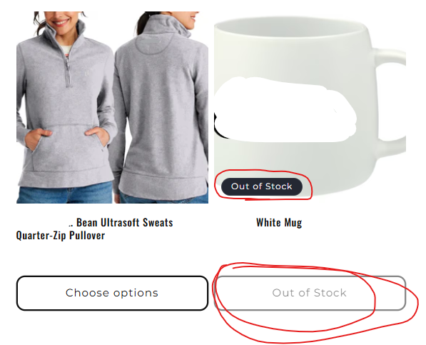 Under ConsiderationIt would be very helpful if products that are out of stock—but not marked as "Closing Out"—automatically display a “Sold Out” or “Out of Stock” label on both the product thumbnail and the product page.