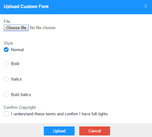 フォントは1つずつアップロードされます。 フォントをアップロードする前にフォントを使用する権限があることを確認するには、[著作権の確認]チェックボックスを選択する必要があります。